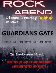 Es ist immer wieder schön, zu Beginn eines Wochenendes gepflegte Heavy Metal Musik live erleben zu dürfen und so war es am heutigen Abend und dem Auftritt von Guardians Gate der Fall. Die Jungs haben durch das Release ihrer CD „The Green Mile“ und regelmäßigen Live Shows ihren Bekanntheitsgrad erheblich ausbauen können. Im Rahmenprogramm einer Rocknacht in Laubuseschbach im Taunus zeigten sich die Jungs um Sänger Flo in absoluter Spiellaune und präsentierten neben dem Klassiker „Hate The War“, von dem es auch ein Musikvideo gibt, weitere Highlights wie „Bloody Tears oder das äußerst eingängige „The Green Mile“.